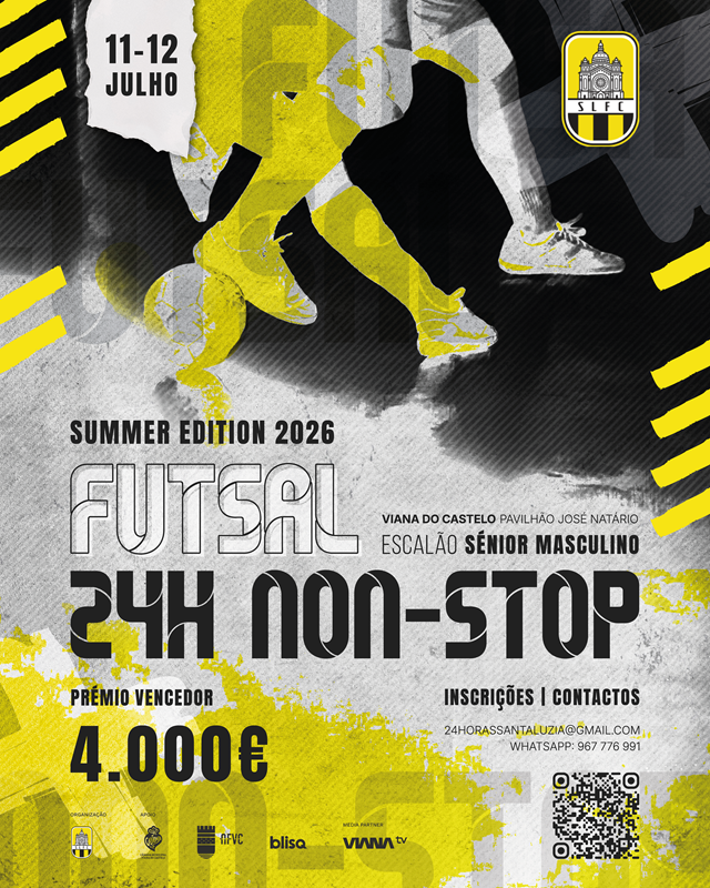 O Santa Luzia vai organizar, nos dias 11 e 12 de julho de 2026 no Pavilhão José Natário em Viana do Castelo, o 24 Horas Futsal – Summer Edition 2026, no escalão Sénior Masculino. As inscrições já estão abertas. 📲 Aponta a câmara do teu telemóvel para o QR Code e descobre todas as informações para garantir a tua participação.